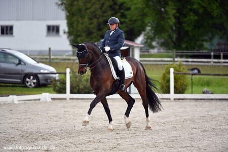 Leichtfüßig, beinahe schwebend trug der neunährige Bayerwallach Dubai W (Decurio/ Swarovski) gezüchtet von Manfred Wöllmer, Carolin Hergenröder (RC Hippo Plus Bamberg- Gaustadt e.V.) mit 70,132 Prozent zum Sieg. Den zweiten Platz belegte der 14-jährige Oldenburger Wallach Hot Chocolate (Hotline/ Rubinstein ...