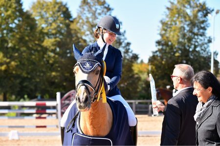 Drei Tage bestes Turnierwetter hatten die Veranstalter der PSG Lindenhof im mittelfränkischen Gösseldorf (Ansbach) gebucht. Am Sonntagnachmittag durfte Sophie Püttner dann mit der Oktobersonne um die Wette strahlen. Golden glänzte auch ihr Ponyhengst Don Diego 70, mit dem sie zuvor mit 69,192% das Finale ...