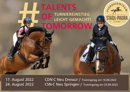 Unter der Headline „Talents of Tomorrow“ steht im Pferdezentrum Stadl-Paura ein neues Projekt, das speziell allen Turniereinsteigern gewidmet ist.Die Turniere, die unter der Kategorie „C NEU“ laufen, bieten ein breitgefächertes Programm für alle Rookies, Turnieranfänger und Reiter, die noch Routine ...