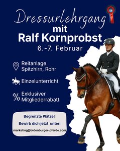Der Oldenburger Pferdezuchtverband bietet am 6. und 7. Februar einen Dressurlehrgang bei dem renommierten Ausbilder Ralf Kornprobst auf der Reitanlage Spitzhirn in Rohr an. Der Unterricht findet einzeln statt und richtet sich an Reiterinnen und Reiter, die gezielt die Weiterentwicklung von Pferd und ...
