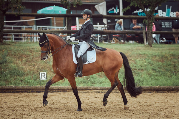 Gleich zwei schwere Dressuren standen heute im mittelfränkischen Brünst auf dem Programm. In der ersten S* ging der Sieg an die Ansbacherin Sophia Scheld mit ihrer zehnjährigen Hannoveraner Stute Dark Velvety. Die silberne Schleife konnte sich Adina Bär vom Stall Eiben Münchberg mit dem ebenfalls zehnjährigen Westfalen Superstar sichern, die Philipp Mücke und Deep Impact auf Rang drei verwies.Bevor die zweite S*-Prüfung im mittelfränkischen Lehrberg beim RFV Brünst über die Bühne gehen konnte, waren zunächst Geduld und pure Kraftanstrengung gefragt. Noch in der vorausgegangenen Prüfung ging ein Regenschauer auf die idyllisch gelegene Anlage nieder, die den Dressurplatz komplett unter Wasser setzte. Nur dank des Einsatzes hochmotivierter Helfer, die zeitweise mit vier Bodenbearbeitungsgeräten arbeiteten, wurde der Platz trockengelegt. Als letzter Reiter startete Johannes B. Rühl vom RFV Bad Homburg mit Johann. Mit einer harmonischen Vorstellung schnappte er Alexandra Sessler, die bis dahin lange in Führung lag, den Sieg vor der Nase weg. Sein Ritt war den Richtern 73,070 Prozent wert, die Pferdewirtschaftsmeisterin Alexandra Sessler erhielt 70,307 Prozent. Auf dem dritten Rang folgte die Bereiterin des gastgebenden Vereins, Marion Fohrer mit Revaldi.Eigentlich war für diesen Sonntag auch eine Qualifikation für die Deutsche Amateurmeisterschaft geplant - die ins Wasser fiel. Nach der sechsten Reiterin öffneten sich die Schleusen des Himmels über Lehrberg. Die Prüfung musste während des Ritts von Bernhard Winkler unterbrochen werden. Die Veranstalter entschieden die Platzierung ohne Beendigung der Prüfung vorzunehmen, sodass es auch keine Qualifikation für die DAM mehr war. Es siegte Sophia Scheid auf Dark Velvety. Zweite wurde Adina Bär mit Superstar, gefolgt von Philipp Mücke auf Deep Impact. (ms/cp)