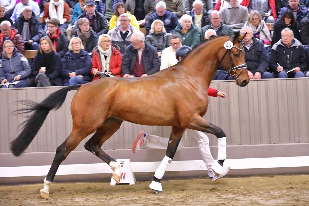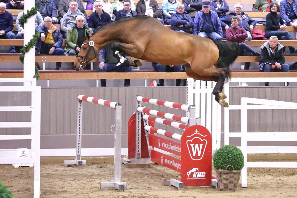 Im Rahmen der Westfälischen Hauptkörung in Münster-Handorf diese Woche durfte sich vor allem ein Bayer freuen: Matthias Schlammiger aus Regensburg stellte insgesamt drei gekörte Springhengste als auch einen gekörten Dressurhengst aus. Besonders stolz dürfte Schlamminger dabei auf seinen Siegerhengst mit der KN 68 sein. Der Sohn des Conthargos aus einer Casall-Mutter wurde am 22.05.2020 bei Hans-Jürgen Heitmann in Dinklage geboren. Nach zunächst noch etwas zurückhaltenden Auftritten am Dienstag, überzeugte der bildschöne Braune am Folgetag Publikum und Jury gleichermaßen. Auch Auktionator Thomas Münch kam ins Schwärmen: „Auffallend in Typ und Konstitution, mit Bewegungsgüte, Abdruck und Vorsicht am Sprung“. Der frischgekürte Springsieger stammt aus dem Mutterstamm des United Touch, welcher wiederum zuletzt unter Richard Vogel für Aufsehen gesorgt hatte, egal ob beim Gewinn des Großen Preises von Warendorf im Rahmen der diesjährigen Bundeschampionate oder beim erst kürzlichen fulminanten Sieg der Stuttgarter Weltcup-Etappe Mitte November. Wie die Kollegen des ZÜCHTERFORUMs » vermelden, wäre der Conthargos-Nachkomme auch Preisspitze der Springhengste geworden. 196.000 Euro entsprachen allerdings nicht den Vorstellungen des Besitzers, so wird dieser nun in Deutschland verbleiben und auf der Station Wilbers aufgestellt.