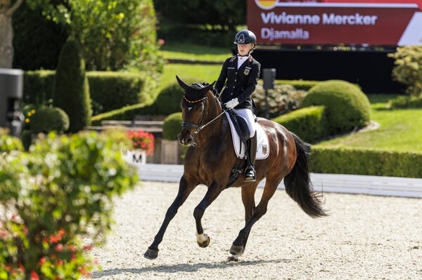 Den rechnerisch größten Anteil zur Goldmedaille trug Bayerin Vivianne Mercker bei. Als dritte deutsche Starterin trabte die 14-jährige Münchnerin mit Djamalla in die Bahn. Die erst siebenjährige Nachkommin des Don Romanov zeigte sich unter dem Sattel der Gymnasiastin motiviert und losgelassen, nutzte immer wieder die Gelegenheit und schnaubte relaxed ab. Vivianne Mercker brachte die Aufgabe nervenstark ins Ziel, nicht einen Haken erlaubte sich das Siegerpaar des Preis der Besten. 83,859 Prozent sollten für die Schützlinge von Franz Trischberger vom Hofgut Allerer nicht nur ein neues persönliches Bestergebnis bedeuten, sondern auch die Spitzenposition in dieser Prüfung.