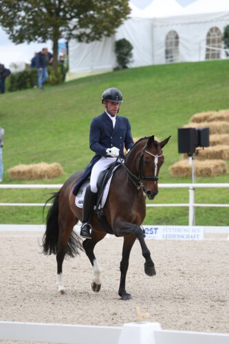 Schon bei der ersten Qualifikation des IWEST Dressur Cups in Winterlingen wurde es klar: Die Bayern wollen es in diesem Jahr wissen. An diesem Wochenende macht der IWEST Dressur Cup beim Birkhof Dressurfestival Halt und wieder gaben die Bayern schon in der Einlaufprüfung den Ton an. Allen voran stand Franz Trischberger, der Sieger der ersten Qualifikation, heute wieder vorne. Schon 2021 hatte Trischberger mit seiner sympathischen Stute Sarotti im IWEST Cup Finale gesiegt. Damals wurde das Finale jedoch coronabedingt nicht im Rahmen der German Masters in der Stuttgarter Schleyerhalle ausgetragen, sondern beim Dressurturnier in Reutlingen. Dementsprechend möchte Franz Trischberger auch vor großer Kulisse im IWEST Cup ganz vorne stehen und dieser Plan scheint aufzugehen. Bei der ersten Qualifikation in Winterlingen standen die beiden an der Spitze und auch in der Einlaufprüfung der zweiten Qualifikation nahmen sie die goldene Schleife in Empfang. Das Erfolgspaar punktete sich mit toll kreuzenden Trabtraversalen, schnurgeraden Serienwechseln und kleinsten Galopppirouetten zu starken 73,6 Prozent. Auch auf dem zweiten Platz folgte eine Bayerin. Kristina Olson drehte mit ihrem Erfolgspartner FBW Dorys Dream ebenso eine schöne Runde und wurde mit 72,5 Prozent belohnt. Tina von Briel wurde mit ihrem neunjährigen Tallahassee beste Baden-Württembergerin und reihte sich mit 71 Prozent auf Platz drei ein. Neben ausdrucksvollen Verstärkungen, Traversalen und guten Galopppirouetten verlor sie in den Zweierwechseln durch einen versprungenen Galoppwechsel sowie einem verspäteten Galopp-Trab-Übergang wertvolle Punkte.