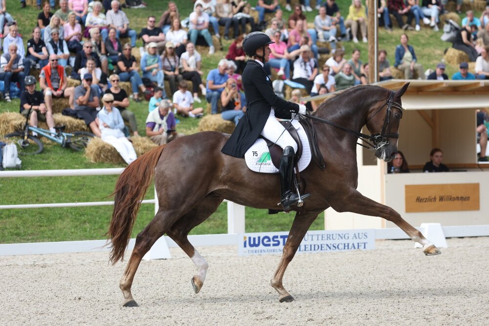 Ein echtes Highlight macht in diesem Jahr wiederum auf dem Birkhof Dressurfestival Halt. Die Rede ist vom Louisdor-Preis. Eine der renommiertesten Serie für acht- bis zehnjährige Nachwuchs-Grand Prix Pferde. Zu den Siegern zählten u.a. Weihegold, Dalera sowie zuletzt Fendi, dem diesjährigen Championatspferd von Sönke Rothenberger. Die Nachwuchshoffnungen starten bei jeder Station mit einer Einlaufprüfung. In der zweiten Prüfung, einer zweiten Dreisterne-Prüfung, geht es dann um die heißbegehrten Finaltickets. Pro Qualifikation ergattern immer die beiden erst platzierten Paare ein Ticket fürs Finale. In der heutigen Einlaufprüfung stand Ingrid Klimke mit ihrem EQUITANAs Firlefranz und starken 75,1 Prozent an der Spitze des kleinen, aber feinen Starterfelds. „Ich bin mit Firlefranz sehr zufrieden. Es war erst seine zweite Intermediaire II“, erläuterte die letztjährige Mannschafts-Bronzemedaillengewinnerin glücklich. Der zehnjährige Franziskus Nachkomme überzeugte mit einer schon weitesgehend sicheren Piaff-Passage-Tour, ausdrucksvollen Verstärkungen und toll nach vorne gesprungenen Einer- und Zweierwechseln. Der Sieger der Herzen folgte auf Platz zwei. Erst wenige Wochen nach ihrem schweren Unfall gelang Yara Reichert mit ihrem eindrucksvollen Springbank eine kleine Überraschung und so reihte sie sich mit 73,9 Prozent auf Platz zwei ein. Besonders überzeugend war die stets beste Anlehnung kombiniert mit ausdrucksvollen Verstärkungen, einer gleichmäßigen Piaff-Passage-Tour und sicheren Serienwechseln. Lisa Müller und Gut Wettlkams Mondrian komplettierten mit 73,3 Prozent das Podest. Neben einer äußerst ausdrucksvollen Trabtour standen teure Fehler in den Einerwechseln. Raphael Netz mit dem vielversprechenden Württemberger Dieudonné (71,6 Prozent) folgte auf Platz vier. Katrin Burger und ihr sympathischer Lusitano-Hengst Incrivel wurden bestes baden-württembergischer Paar und rangierten mit 70,6 Prozent auf Platz sieben. Am Sonntagnachmittag wird beim Birkhof Dressurfestival über die beiden heißbegehrten Finaltickets entschieden. (msb)
