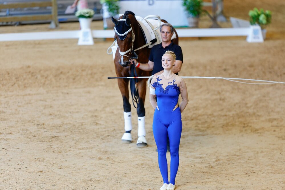 In der Altersklasse der Junioren kam nach dem Pflichtprogramm ein weiterer bayerischer Podestplatz dazu. Sarah Liersch turnte sich mit Longenführer Alexander Hartl in völliger Leichtigkeit zu Platz zwei und war der Führenden Amari Santamaria Diaz (7,943 Zähler) mit 7,777 Zählern auf den Fersen. Auch Laura Seemüller und ihr Longenführer Alexander Zebrak, die vor wenigen Wochen bei der WM ihr Championatsdebüt feierte, sicherte sich mit Platz fünf (7,572 Zähler) eine gute Ausgangsposition. Marlene Le Bris mit Longenführer Alexander Hartl schaffte es ebenso in die Top10 (7,484 Zähler). Leonie Hamze und Julia Hein folgten auf den Plätzen 18 und 26. Selina Look und Sarah Berchtold nahmen die Plätze 41 und 44 ein. In der Herrenwertung nahm Sebastian Renkl mit Longenführerin Anna-Lena Schäfer Platz sechs ein (7,115 Zähler). (msb)