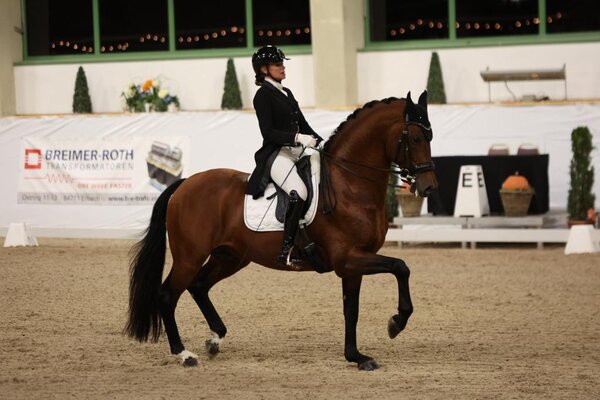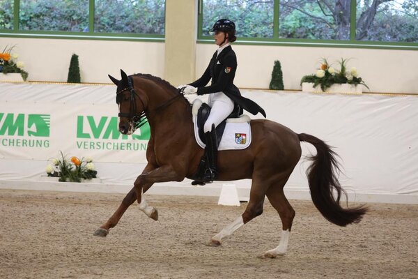 Yara Reichert war mit ihren beiden Hengsten Valverde und Springbank als eine der Favoriten ins diesjährige Halbfinale der beliebten Serie DERBY Stars von Morgen eingezogen. Mit beiden Pferden hatte sie in diesem Jahr nicht nur irgendwie in der Königsklasse Fuß gefasst, sondern etliche Siege bis hin zum Grand Prix gesammelt und sich neben der Qualifikation zum Halbfinale DERBY Stars von Morgen auch für den Louisdor Preis qualifiziert. In der heutigen Einlaufprüfung auf Gut Ising legte sie mit ihrem neunjährigen Vitalis-Nachkommen Valverde NRW vor. Fast schon am kleinen Finger meisterten die beiden jede Lektion und punkteten unter anderem mit einer schon sehr gereiften und gleichmäßigen Piaff-Passage-Tour, kleinsten Galopppirouetten und sicheren Serienwechseln. Die Richter belohnten dies mit starken 75,3 Prozent, eine Messlatte an der sich die restlichen Starter wahrlich ausbissen. Der „größte“ Konkurrent kam schlussendlich aus dem eigenen Stall. Ihr neunjähriger Hengst Springbank sah ein kleines Gespenst am Richtertisch B, mit welchem er sich jedoch im Verlauf der Prüfung immer mehr „anfreundete“. So punktete er heute besonders in der Galopptour, beispielsweise mit den Einer- und Zweierwechseln sowie in der zweiten Galopppirouette. Am Ende standen gute 73,7 Prozent auf der Ergebnistafel. Auf den Plätzen drei und vier folgte echtes Championatsfeeling. Benjamin Werndl steuerte seinen Discover zu 73 Prozent und Rang drei. Der zehnjährige Don Frederic-Nachkomme zeigte sich heute sehr motiviert, gar übermotiviert, wodurch er unter anderem durch in den Zweierwechseln sowie durch einen nicht ganz gelassenen Durchsprung in der Galopppirouetten wertvolle Punkte verlor. Dennoch sind die beiden sicherlich ein Paar, die Yara Reichert morgen im Halbfinale auf der Liste haben sollte. Dorothee Schneider und ihr zehnjähriger Franziskus-Nachkomme punkteten sich zu 72,8 Prozent. Eine ebenso starke Runde zeigten Johanna Wadenspanner und ihre sympathische Stute Alouette. Die beiden brillierten besonders in der Trabtour, aber auch die Galopppirouetten gelangen auf kleinstem Kreis. Demgegenüber stand zu Beginn der Einerwechsel ein fehlerhafter Galoppwechsel (70,8 Prozent). Uwe Schwanz und sein Don Lauris komplettierten mit 70,7 Prozent das Feld der Platzierten. Alles in allem überzeugte das heutige Starterfeld durch ein enorm dichtes und hohes Niveau, was Lust auf morgen machte!
