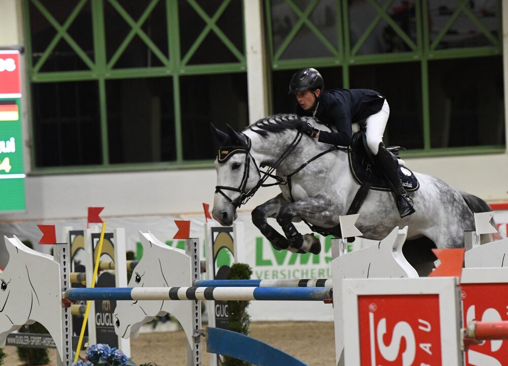 Katharina Mock legte mit ihrem Herzenspferd Pezi Baer eine fulminante Runde vor und setzte ihre Kollegen unter Druck. Das funktionierte, denn schon Maximilian Ziegler ärgerte sich über einen Abwurf, allerdings mit einer sehr schnellen Zeit. Dann kam Wolfgang Puschak, der seine Schimmelstute Zirona Blue gesattelt hatte. Er schlug Mock deutlich und setzte sich an die Spitze. Ob das schon reichen sollte? Dann hielt das Publikum den Atem an: Verena Haller, die kurz vor dieser S** Prüfung das Goldene Reitabzeichen verliehen bekommen hatte, flog nur so durch die Halle – Platz zwei mit Carry Anne mit 0,45s Abstand.