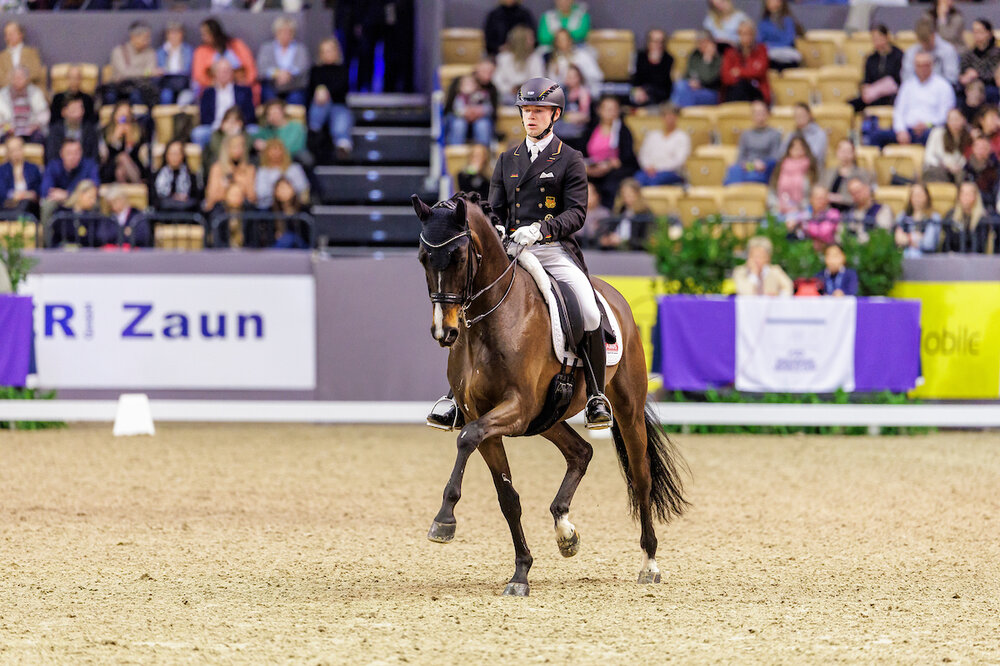 Und was soll man sagen, es hätte auch für ein paar Plätze weiter vorn gereicht. Denn an der Spitze wurde es wahrlich eng. Nur 7,5 Punkte treten die ersten vier Paare. „Es war nicht einfach heute einen Sieger zu finden,” beschrieb Chefrichter Henning Lehrmann die knappe Entscheidung zwischen den ersten vier Paaren. „Insgesamt hatten wir viele gute Teilnehmer, und es war ein solides Niveau. Das kann man an den Ergebnissen sehen. Es war nicht so einfach, einen klaren Spitzenreiter zu finden, weil jeder einen anderen Sieger hatte. Aber wenn man viele Reiter hat, die um die 73% liegen, dann ist der Standard natürlich gut“, erläuterte Lehrmann. Am Ende setzte sich die Holländerin Emmelie Scholtens mit Indian Rock (73,4 Prozent) durch. Der Apache-Sohn beeindruckte durch aufwändiges Abfußen und hohe Fähigkeit zur Lastaufnahme, womit er in den Pirouetten punkten konnte. Zu den weiteren Highlights zählten die gut nach vorne gesprungenen Serienwechsel. In den Piaffen schiebt sich der Hengst teilweise zu sehr zusammen, wodurch ein gleichmäßiges Abfußen nicht immer erhalten werden kann. Knapp geschlagen und dennoch mit einem neuen Personal Best zeigte sich die Belgierin Larissa Pauluis, die sich im Sattel von Flambeau über Platz zwei freuen durfte. Matthias Alexander Rath wurde mit Destacado bester Deutscher und reihte sich mit 73,2 Prozent auf Platz drei vor Patrik Kittel mit Forever Young (73,1 Prozent ein.
