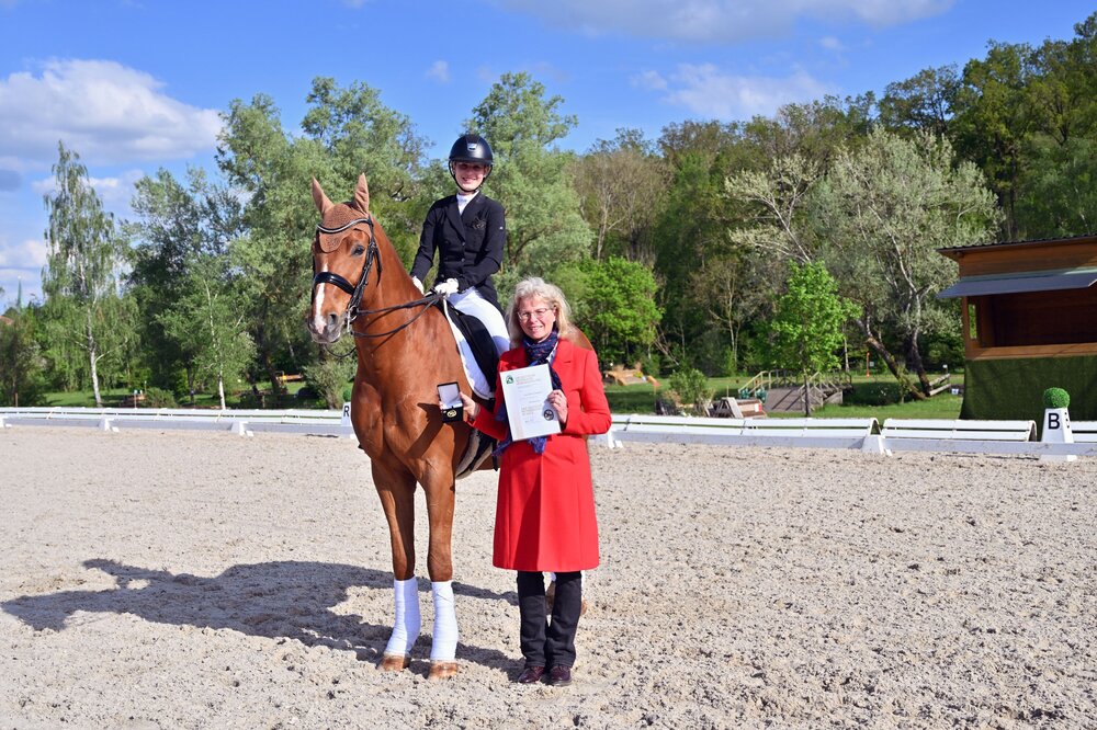 Beim Turnier in Ansbach hat Eileen Henglein das Goldene Reitabzeichen aus der Hand von Richterin Uta Härlein erhalten