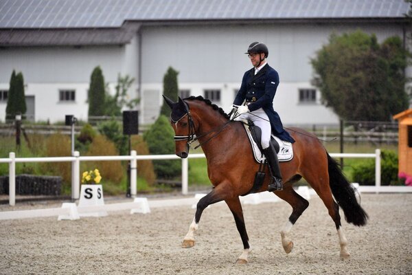 Aus sportlicher Sicht zeigten sich auch heute tolle Leistungen. Allen voran wurde Sebastian Horler im Sattel von seinem vielversprechenden, achtjährigen Wallach Enrico mit einem S-Sieg belohnt. Schon in den vergangenen Wochen hatte sich der S-Sieg angekündigt. „Eigentlich war der Plan, dass er in diesem Jahr in die schwere Klasse reinwächst. Dass das jetzt so schnell so sicher und gut klappt, hätte ich auch nicht erwartet“, beschreibt Sebastian Horler. Die konstant guten Erfolge der letzten Wochen hängen eng mit dem Charakter von Enrico zusammen. „Er ist charakterlich wirklich eine Ausnahme, lernt total schnell und ist immer super motiviert. Er ist auf dem Turnier genauso wie zu Zuhause zu reiten. Jetzt hat er verstanden, was gefordert ist und ruft das trotz seines jungen Alters schon echt routiniert ab“, beschreibt Sebastian Horler den Escolar-Nachkommen, der ein echter Streber ist. Die Richter belohnten die technisch schon sehr versierte Runde mit Highlights in unter anderem dynamischen Verstärkungen, gut zentrierten Galopppirouetten und ausdrucksvollen Seitengängen in der technischen Note mit 71,9 Prozent. In der Note standen starke 82,4 Prozent, was in Summe ein Spitzenergebnis von 77,1 Prozent und die goldene Schleife machte. „Jetzt bekommt er erst einmal Pause und dann mal schauen was kommt. Eine Qualifikation zum Nürnberger Burgpokal der jungen Dressurpferde oder auch seine erste S** wären ein Traum“, blickte Sebastian Horler in die Zukunft. Auch Sophia Scheld und ihrer Nachwuchshoffnung Donna Noble gelang eine gelungene Runde, die die Richter mit 72,7 Prozent und Platz zwei belohnten. Paulina Antonia Welcker mit Zenturion (71,8 Prozent) reihten sich auf Platz drei ein.