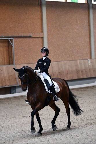 Im Nachwuchsbereich wiederholte Marie Sohler ihren gestrigen S-Sieg und schnappte sich auch heute mit Askehavens Beau Sancy und 71,7 Prozent einen überlegenen Sieg. Im nur aus drei Startern bestückten Starterfeld folgten Emilia Winter mit Dante Noir (67,4 Prozent) und Jana Reichl mit DSP Belcanto (67,3 Prozent). Auch bei den Junioren sah man eine Wiederholungstäterin und Helena Moosreiner schnappte sich knapp vor Vivianne Mercker erneut den Sieg. Helena Moosreiner wusste mit ihrem Vitali erneut zu überzeugen und punktete mit gut kreuzenden Trabtraversalen, ausdrucksvollen Verstärkungen und sicheren Galoppwechseln. Bei den Galoppwechseln könnte sich Vitali teilweise noch besser tragen und auch die Schrittpirouetten könnten sich noch aktiver abfußend zeigen. Schlussendlich setzte sie sich mit 70,8 Prozent gegen ihre Trainingskollegin Vivianne Mercker mit Djamalla OLD (70 Prozent) durch). Emily Rother und Jasper komplettierten mit 68,8 Prozent das Podest.