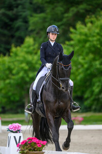 Auch die Galopptraversalen gelangen sicher in feiner Anlehnung, die fliegenden Galoppwechsel auf einer Schlangenlinie mit vier Bögen immer bei Überreiten der Mittellinie waren nicht immer ganz am Punkt, dafür gut im bergauf. Der starke Trab auf der letzten Mittellinie bildete einen gelungenen Schluss der Kür. Insgesamt gab es für die Vorstellung 76,667 Prozent und den Sieg vor Maria Teresa Pohl und Lilly Marie Collin. Josephine Ruppert kam auf Platz neun mit 71,558 Prozent im Sattel ihrer Bella Donna.