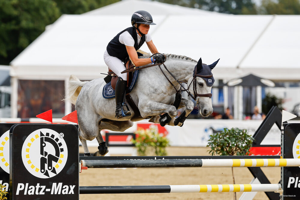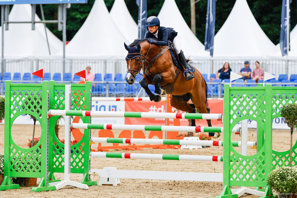 Erste Siegerin der Bundeschampionate 2024 wurde die Hannoveraner Chacoon Blue-Tochter Chaqueen aus der Zucht der Zuchtgemeinschaft Kruse (Walsrode), die von David Will (Marburg) in dem qualitativ stark besetzten S-Springen mit 39 Teilnehmerpaaren fehlerfrei in 65,86 Sekunden ins Ziel gebracht wurde. Zweite wurde Greta Reinacher (Rosendahl) mit dem Holsteiner Wallach Brilliant Balou S (0 Strafpunkte in 66,20 Sekunden). Platz drei ging an Wills Stallkollegin Sophie Hinners (Pfungstadt) mit der Oldenburger Diaron-Tochter SMA Disney (0/66,33). Mit dem Westfalen Fiorucci JH konnte Reinacher zudem einen Doppelerfolg erzielen. Denn mit dem Franco-Sohn gab es für sie auch noch Platz vier (0/67,00). TH