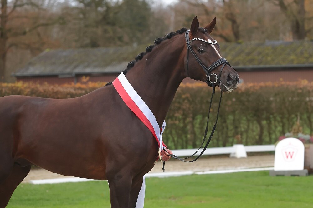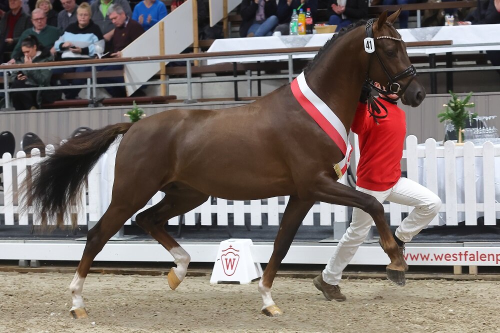 In Münster Handorf wurden heute die Prämienhengste rangiert und die Sieger und Reservesieger gekürt. Auf dem Dressur-Parkett kamen dabei sowohl Sieger als auch Reservesieger aus bayerischer Hand. Zum Siegerhengst wurde ein Dunkelfuchshengst vom Vitalis – Fürst Jazz aus der Zucht der ZG Harms, Großheide und ausgestellt von der BG Franz-Georg Ottmann und Thomas Berger gekürt. Der athletische Hengst avancierte anlässlich der Auktion zur Top Offerte und wurde für 850.000 Euro zugeschlagen. Zum ersten Reservesieger wurde der ebenfalls in edler Dunkelfuchs-Jacke auftretende Sohn des Toto Gold – Floriscount aus der Zucht von Ruth Volkwein, Ibbenbüren und dem Besitz von Yara Reichert, Buch berufen. Dieser Hengst stand nicht zum Verkauf.