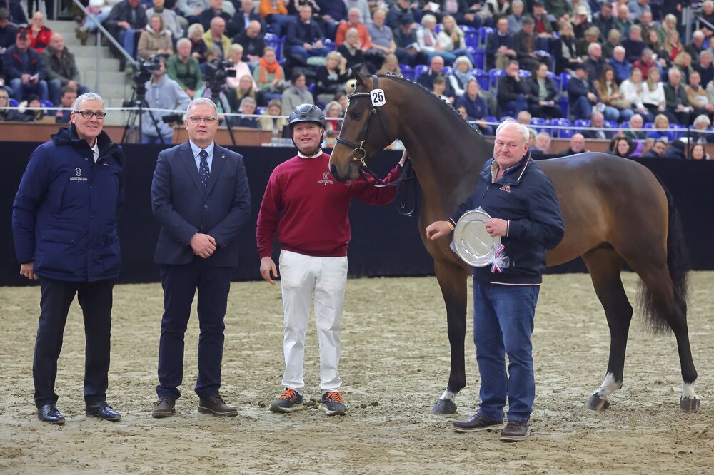 Er ist geboren am ersten April 2022, doch dieser Schimmel ist alles andere als ein April Scherz. Der Sohn des Colestus – Caretino mit Namen Conchezz ist Holsteiner Siegerhengst 2024. Gezogen von Sören von Rönne konnte der typstarke Schimmel aus dem Holsteiner Stamm 6688 Publikum und Kommission gleichermaßen begeistern. Modern im Typ, schwungvoll in der Bewegung und überragend am Sprung, so fand der Hengst schnell viele Anhänger. Ausgestellt wurde Conchezz von Manfred von Allwörden.