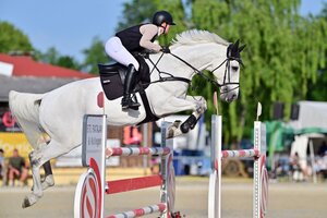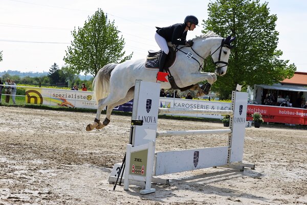 Das Punkte-S*-Springen war der Höhepunkt des Springturniers auf der Reitanlage Kunze in Langenau. Stefanie Paul legte im Sattel der Hannoveraner-Stute Zara White eine blitzsaubere Nullrunde aufs Parkett und heimste sich damit den Sieg in dieser Prüfung ein. Zara White, eine achtjährige Tochter des Zirocco Blue, hatte im vergangenen Jahr unter anderem das Youngster-Tour Finale bei der Pferd International in München-Riem gewonnen. Paul steuerte die sprunggewaltige Schimmelstute, die nur so mit der Höhe spielte, rhythmisch und stets im Fluss durch den Parcours. Die Amazone aus Altusried hatte nicht nur durch stilistisch feines Reiten überzeugt, sondern auch die volle Punktzahl erreicht und dabei mit 59,26 Sekunden den Sieg erritten. Die 60er-Marke zu knacken war im 32-köpfigen Starterfeld lediglich noch Sönke Aldinger gelungen. Der Jungprofi vom Mühlhausener Josefshof kassierte allerdings am achten Hindernis einen Fehler, wodurch ihm wichtige Punkte für eine Platzierung fehlten. Auf Rang zwei galoppierte Gunther Döhler, der im fränkischen Simmershofen einen Hof für Sportpferde und Senioren betreibt. Vorgestellt hatte der Springausbilder die Niederländer-Stute Jara, mit der er seit Jahren erfolgreich unterwegs ist. Rang drei ging nach Baden-Württemberg, nämlich an Alina Hertwig und ihren Erfolgspartner Lucky. In gewohnter Manier drehte das eingespielte Team eine harmonische Nullrunde, die am Ende mit der weißen Schleife belohnt wurde. Auf dem vierten Rang triumphierte abermals die Siegerin Stefanie Paul, diesmal mit ihrem Paradepferd Cheeky Charly. Rund vier Sekunden langsamer unterwegs war India Letizia Fux mit dem zehnjährigen Holsteiner Stromerle. Die Beiden sicherten sich Platz fünf vor Stefanie Fraunholz mit Coleen auf Rang sechs. Zu den weiteren Platzierten gehörten Remo Allgäuer, erneut Gunther Döhler, Patrick Afflerbach, Nathalie Steinhauser sowie Sven Zeller.