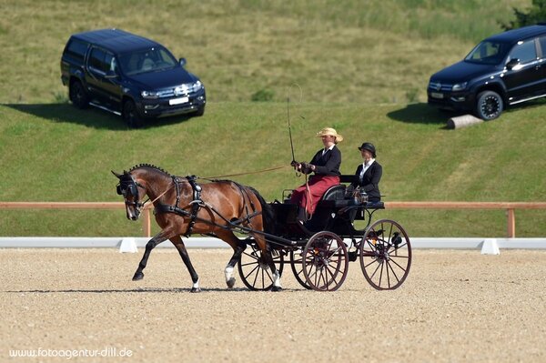 In der ersten Teilprüfung, der Dressur am heutigen Tag, lief es bei der erfolgreichen Fahrerin der Pferdefreunde Parsdorf-Vaterstetten e.V. sehr gut. Anika Geiger konnte mit ihrer DSP Annabelle eine gewohnt souveräne Vorstellung im Viereck zeigen und wurde für diese mit 67,43 Prozent belohnt. Dieses Ergebnis reichte in der heutigen Wertung für den zweiten Platz. Gewinnen konnte Claudia Lauterbach vom RFV Dillenburg mit 68,40 Prozent. Eine weitere Schleife für den Freistaat sicherte Veronika Irregen, die mit ihren Ponys im Zweispänner bereits am Freitag mit 62,82 Prozent zum dritten Platz gefahren ist. Im morgigen Marathon wird es noch einmal spannend, denn beim Versuch fehlerfrei die schnellsten Zeiten durch die Hindernisse zu fahren, werden wichtige Punkte für die kombinierte Wertung und somit auch für die Deutsche Meisterschaften der Einspänner Pferde gesammelt.