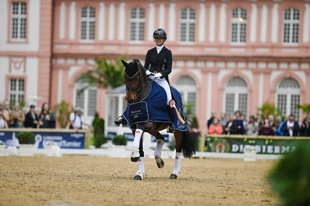 Jessica Neuhauser, die international für die Schweiz startet, und der 14-jährige Wallach begannen zugleich mit einer gleichmäßigen und ausdrucksvollen Trabtour. Dabei punkteten sie unter anderem mit energisch abfußenden Piaffen und Passagen. Im Galopp bildeten die top zentrierten Galopppirouetten und die sicheren Zweierwechsel einer der Highlights. In den Einerwechseln schlich sich ein kurz gesprungener Wechsel ein. Alles in allem belohnten die Richter diese sichere und konzentrierte Runde mit knapp 70 Prozent und dem verdienten Sieg. Nun darf sich das Erfolgsduo in der beeindruckenden Atmosphäre von Wiesbaden auf die Flutlichtkür freuen. Im Grand Prix reihten sich Nadine Plaster mit Shiva (69 Prozent) und Jennifer Buda mit Daily Fun (67,5 Prozent) auf den weiteren Podestplätzen ein.