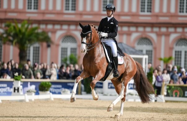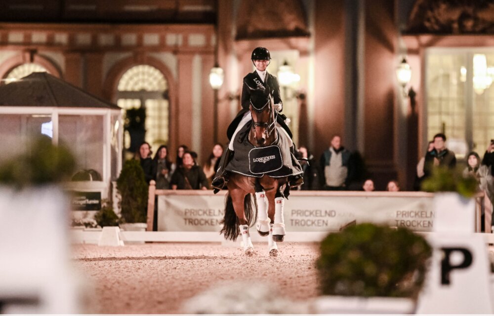 72,2 Prozent – das ist ein Wort. Dieses Ergebnis erzielten Benjamin Werndl und sein Quick Decision in der Qualifikation zum Louisdor Preis. Dabei brillierten die beiden vor allem in zwei Aspekten, absolute Lockerheit und größte Harmonie bei bestem Seitenbild. Die Trabtour gelang sehr gleichmäßig, auch die Piaff-Passage-Tour. Ein absolutes Highlight bildete dann aber die Galopptour mit gut zentrierten Galopppirouetten sowie schnurgeraden und toll ins Bergauf gesprungenen Serienwechseln. „Wir haben eine überragende Galopp-Tour gesehen“, erläuterte Katrina Wüst, die im Anschluss jeden Ritt kommentierte. „Es ist wunderbar, wie Du das Pferd immer total vor Dir hast, mutig zulegst, man merkt, dass er sofort zurückkommt – alles passt, wie aus einem Guss.“ Damit können Benjamin Werndl und Quick Decision nun das Finale in der Frankfurter Festhalle im Dezember fest im Terminkalender eintragen. Ebenso ein Finalticket sicherte sich Tobias Nabben mit dem vielversprechenden Wallach Forster, der besonders in der Piaff-Passage-Tour zu überzeugen wusste (71,3 Prozent). Franziska Stieglmaier und Zahin folgten auf einem guten sechsten Platz (68,9 Prozent).