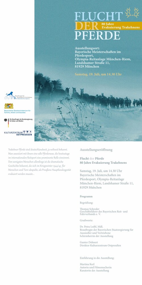 Eine ganz besondere Ausstellung öffnet anlässlich der Bayerischen Meisterschaften auf der Olympia-Reitanlage in München-Riem ihre Pforten: Die „Flucht der Pferde“ wird dort ab Samstag, 19. Juli um 14.30 Uhr gezeigt. Die Ausstellung wird an den Wochenenden bis zum 17. August für Besucher geöffnet sein. Der Eintritt ist kostenfrei.