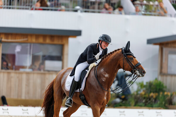 Hinter Verboomen und Laudrup-Dufour folgte die geballte deutsche Kraft. Championats-Debütantin Katharina Hemmer hatte mit Denoix PCH vor dem letzten Viertel der Prüfung eine beeindruckende Messlatte gelegt und durfte sich sogar über ein neues Personal Best von 78,6 Prozent freuen. „Das war unser Personal Best. Und nicht nur die Punkte, sondern auch das Gefühl war Personal Best“, freute sich Katharina Hemmer. Von der ersten Sekunde an präsentierte sich Denoix total energisch, dynamisch und fokussiert. Ein technisch fehlerfreier Ritt, bei dem es auch sonst nicht viel zu meckern gab. Dynamische Piaffen und Passagen, weit kreuzende Trabtraversalen, eine feine Anlehnung, sicher nach vorne gesprungene Serienwechsel. Vielleicht hätte sich der Durchsprung in den Galopp-Pirouetten noch besser zeigen dürfen, aber das war wahrlich Meckern auf allerhöchstem Niveau. Katharina Hemmer und Denoix waren über sich hinausgewachsen und hätten eine Medaille wahrlich verdient. Schlussendlich wurde es für die beiden der undankbare vierte Platz.