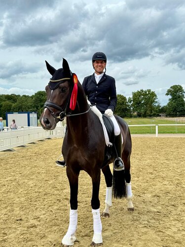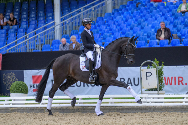Bereits in den vergangenen Wochen hatten Giroud (v. Grand Galaxy Win-Don Index, Z. Ernst Janze, B. Aubenhausen Dressage GmbH u. Annette Göbelsmann-Schweitzer) und sein Ausbilder Adrian Munoz Jurado für Aufmerksamkeit gesorgt. In Warendorf knüpften die beiden nun an ihre Erfolgsserie an und zogen bei den fünfjährigen Dressurpferden auf direktem Wege ins Finale ein. Absolut bestechend war die Trabtour. Viel Elastizität bei guter Balance und Selbsthaltung führten zu einer Note von 9,2. Im Schritt fand der Wallach noch nicht zur optimalen Losgelassenheit (7,8). Im Galopp stand dann aber wiederum eine gute 8,4. Die Note für die Durchlässigkeit von 8,2 und den Gesamteindruck von 8,8 komplettierten die Endnote von 8,48. Das bedeutete schlussendlich Rang fünf in der ersten Abteilung und das Finalticket.