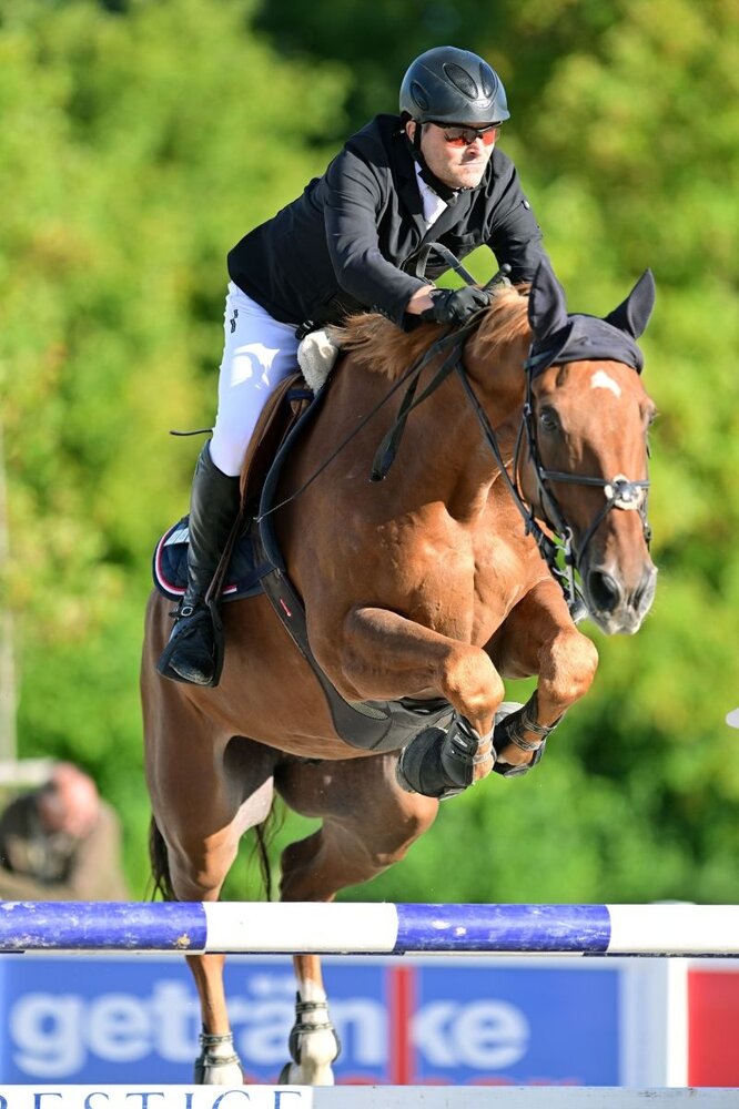 Bereits als sechster der insgesamt 44 Starterpaare brachte der Versicherungskaufmann und Amateur-Springreiter Ralf Rundel seinen zwölfjährigen Nabab de Reve-Sohn Nice Behaviour an den Start. Schon fast siegessicher und mit seiner großen Routine meisterte er die Aufgaben mit hoch angelegtem Grundtempo, um mit gutem Fluss und einer schnellen Zeit die nachfolgenden Starter unter Druck zu setzen. Es schien zugleich so, als wäre eine sichere Nullrunde in dieser Punktespringprüfung die bessere Variante, die zum einen Samanta Laack aus Öfingen verfolgte, sowie auch Juliana Dammers aus Königsbrunn. Beide Damen wussten den Parcours mit genügend Vorsicht und dem richtigen Maß an Risiko anzugehen. Damit waren sie zunächst auf den Rängen zwei und drei gelandet, wäre da nicht noch Baden-Württemberger Benjamin Fischer mit seinem zweiten von insgesamt drei Pferden gewesen. Mit dem Sohn des Messanger Mumbai aus der Zucht des Gestüts Lewitz nahm er die Verfolgung nochmals auf, musste sich jedoch knapp zwei Sekunden hinter Rundel einreihen.