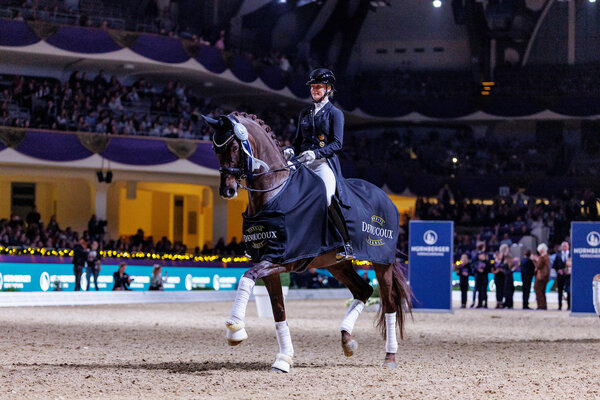 „Ich bin etwas sprachlos. Dieser Hengst ist vom Kopf her eine Granate. Er ist ein totaler Musterschüler“, schwärmte Charlott-Maria Schürmann, die ihr Glück nach der Prüfung kaum fassen konnte. Nach ihrem Sieg in der Einlaufprüfung gab sie mit dem Livaldon-Nachkommen (v. Livaldon-Fürstenball) aus der Zucht von Johannes Hesselink auch im Finale in überlegener Art und Weise den Ton an. Dabei ritt die Dressurausbilderin voll auf Angriff oder wie sie es selbst beschreibt: „Ich hatte kurz etwas Sorge, dass er sich von der Kulisse ablenken lässt. Doch wenn er die Glocke läuten hört, weiß er genau, was er machen soll. Ich kenne ihn in- und auswendig und vertraue ihm zu 1000 Prozent. Ich weiß, dass er keinen Fehler macht und dass ich 150 Prozent geben kann. Denn dann wird er einfach immer besser!“ So starteten die beiden schon in der Trabtour mit viel Dynamik und Fluss in die Prüfung. Der Schritt gelang raumgreifend und losgelassen schreitend. Wie in allen Grundgangarten bestach die Prüfung dadurch, dass die Reiterin alle Tempi voll und sehr präzise herausreiten konnte. In der Galopptour bildeten die top zentrierten Galopppirouetten und die toll nach vorne gesprungenen Serienwechsel, bei welchen die Diagonale fast schon zu kurz schien, absolute Highlights. Zum Abschluss gab es eine kleine Stockung, als der Hengst in der Einleitung zum Rückwärtsrichten kurz vor seinem eigenen Schatten erschrak. Das war jedoch der einzige Schreckmoment. Und so verzauberte Life Time FRH einmal mehr nicht nur seine Reiterin, sondern ebenso das Frankfurter Publikum und die Richter. Evi Eisenhardt, Chefrichterin der Prüfung, brachte es abschließend auf den Punkt: „Im Finale wurde nochmal deutlich besser geritten als in der Einlaufprüfung. Die Siegerin hat es nochmal allen vorgemacht. Schon die Trabtour war super. Im Galopp wurde ich dann immer kleiner und dachte, hoffentlich geht das gut. Er hatte ganz schön Dampf drauf, aber es hat super geklappt!“ Charlott-Maria Schürmanns Beschreibung als Musterschüler passt auf Life Time FRH in doppelter Hinsicht: Denn der Hengst legte bis jetzt eine wahre Bilderbuchkarriere aufs Parkett. Während er sich schon zweimal für den Nürnberger Burgpokal qualifiziert hat, hatte das Erfolgsduo schon dreimal die Ehre, bei den Weltmeisterschaften der jungen Dressurpferde an den Start gehen zu dürfen. Im vergangenen Jahr hatten sich die beiden die Krone aufgesetzt und sich den Titel des Weltmeisters der siebenjährigen Dressurpferde gesichert. Nun folgte also die nächste Krönung, besser geht’s kaum.